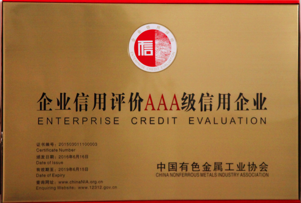 2016年企業信用評價AAA級信用企業—中國有色金屬工業協會 -