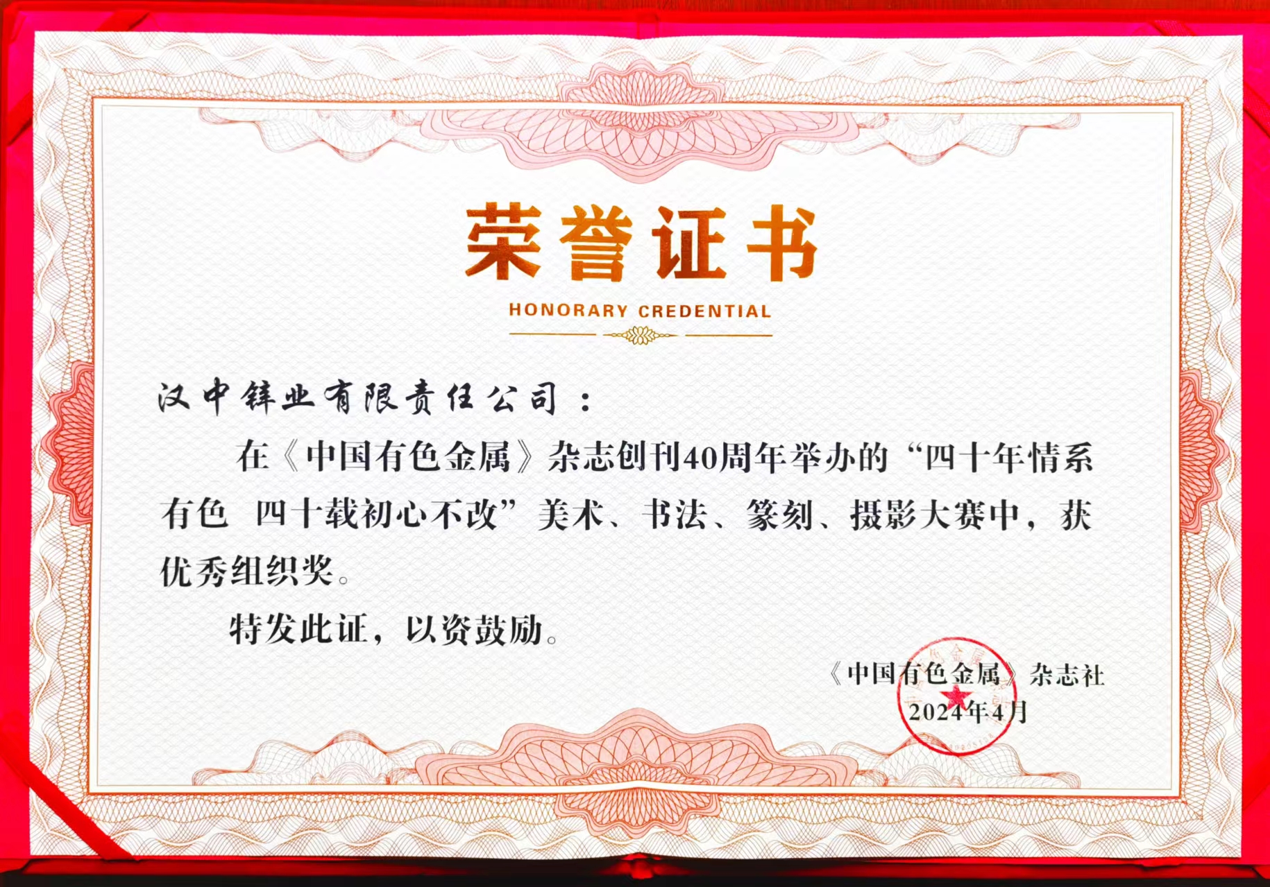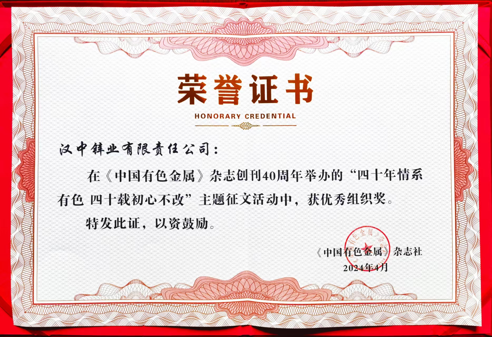公司榮獲“四十年情系有色 四十載初心不改”主題征文優秀組織獎 -
